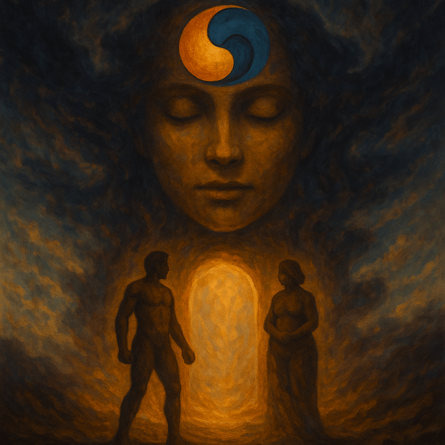This differentiation, symbolized by the mythic separation from the “first parents,” marks the beginning of self-awareness. In mythic language, the ouroboros — the eternal feminine that contains both creation and destruction — gives birth to duality. From this unity arise the first masculine and feminine forms — the primordial parents of myth (Jung, 1956; Neumann, 1954).