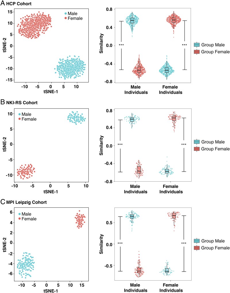 The last of the three studies was conducted by Srikanth Ryali and colleagues earlier this year in 2024 that utilized artificial intelligence and large multicohort functional MRI datasets consisting of 1,000 20-to-35-year young adults to help better understand sexual differences in organizational brain functionality. These differences were predominantly found in the organizational and functionality of the default mode network, striatum, and limbic network. These findings were not only replicable and generalizable, but they were also behaviorally relevant, and thus challenge the notion of a continuum in male-female brain organization. The researchers of this study obtained data upon approval from the Max Planck Institute of Leipzig, the Human Connectome Project, and the Nathan Kline Institute which also included informed consent on the part of participants. Their work was also supported and approved by the National Institute of Health, Transdisciplinary Initiative and Uytengsu-Hamilton 22q11 Programs, Stanford Maternal and Child Health Research Institute and NARSAD Young Investigator Award, and thus fulfill certain criteria of the APA code of ethics (2017).
