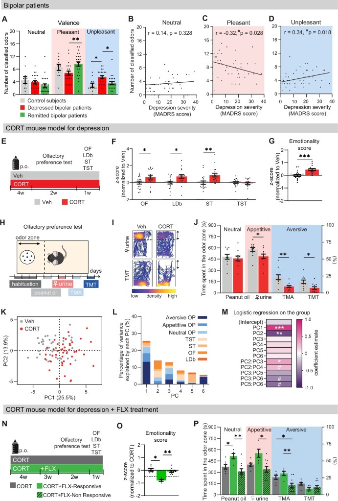 The first study to be examined focuses on the effects of depression on the perception of positive and negative stimuli. This research was conducted by Mathilde Bigot and colleagues earlier in 2024 with approval from the Human Research Ethics Committee, CPP-Ile de France IV (2015/44), and support from Agence Nationale de la Recherche Grants and other such enterprises. The researchers recruited 48 participants with 25 being in a euthymic state and 23 a depressive or mixed state that ranged in age from 18-65 years old. They then had the participants participate in a identification task of the Sniffin’ sticks test while an odor valence assignment was evaluated during the process. These results were then paralleled with previous work on mice models of depression wherein mice were chronically administered corticosterone (Bigot et al., 2024).