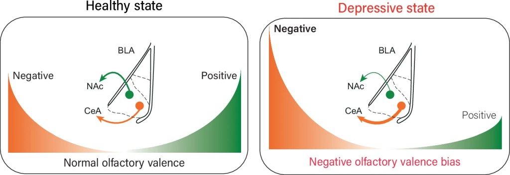 The results of these two evaluations found that both mice and humans during depressive states demonstrated an acute and global shift towards a negative assessment of both pleasant/attractive and unpleasant/unattractive odors. One particular area of the brain that was of interests was the basolateral amygdala (BLA) circuits wherein negative and positive valence evaluations of attended stimuli are processed. This circuit becomes disrupted during depressive states which increases proclivity towards a more negative valence bias in the evaluation of both positive and negative stimuli. The findings help shed light on the potential cause of negative bias towards attended stimuli during depression that could help discover future treatment options (Bigot et al., 2024).